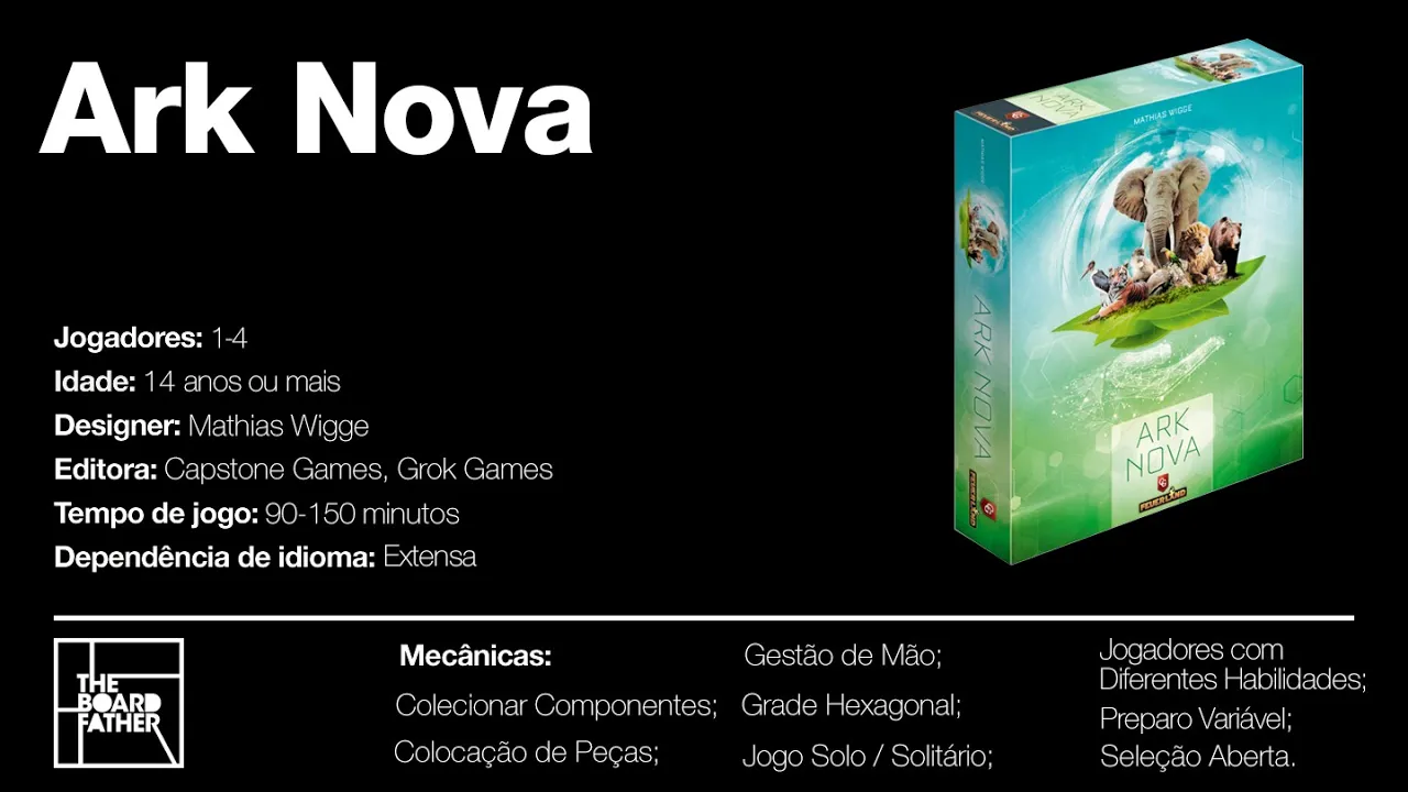 Em Ark Nova, você planejará e projetará um zoológico moderno e cientificamente gerenciado. Com o objetivo final de possuir o zoológico de maior sucesso, você construirá recintos, acomodará animais e apoiará projetos de conservação em todo o mundo. Especialistas e edifícios exclusivos irão ajudá-lo a atingir esse objetivo.